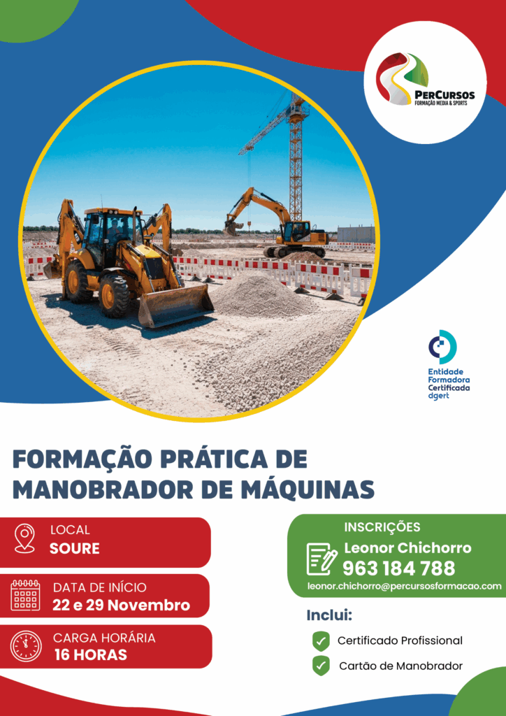 A “Percursos”, entidade formadora certificada pela DGERT, vai realizar uma Formação de Manobrador de Máquinas (16h) nos dias 22 e 29 de novembro, com componente teórica e prática.