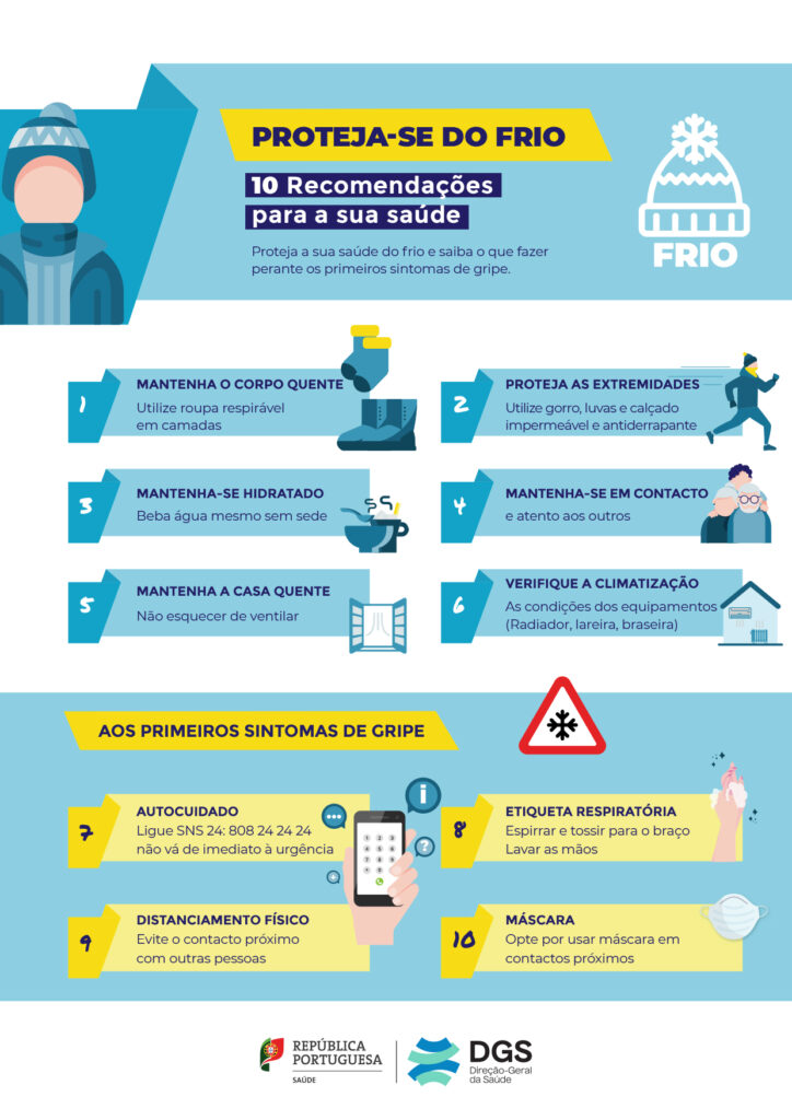 A Direção-Geral da Saúde (DGS) reforça a recomendação para avacinação contra a gripe e COVID-19, bem como a adoção das seguintes medidas, para se proteger do frio e das infeções respiratórias: