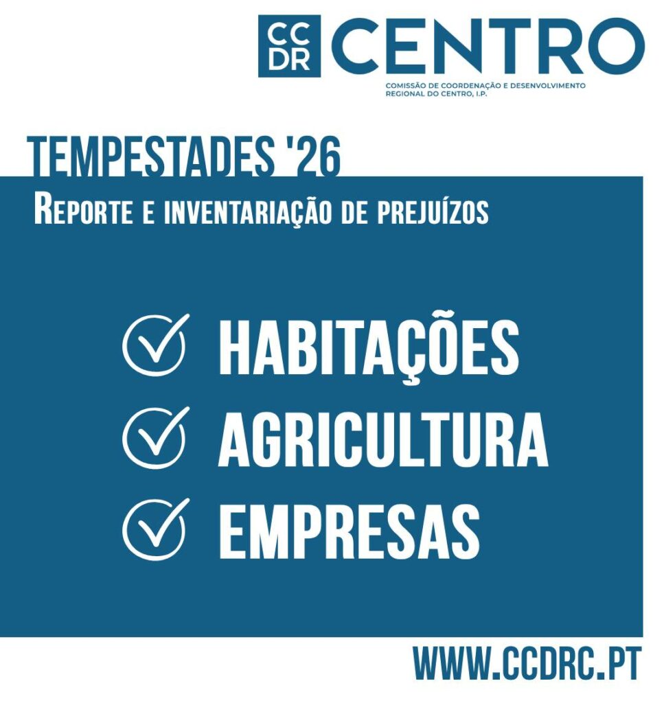 Na sequência da publicação da Resolução do Conselho de Ministros n.º 15-B/2026, de 30 de janeiro, informa-se que se encontram disponíveis, no site da 𝐂𝐨𝐦𝐢𝐬𝐬ão 𝐝𝐞 𝐂𝐨𝐨𝐫𝐝𝐞𝐧𝐚ção 𝐞 𝐃𝐞𝐬𝐞𝐧𝐯𝐨𝐥𝐯𝐢𝐦𝐞𝐧𝐭𝐨 𝐑𝐞𝐠𝐢𝐨𝐧𝐚𝐥 𝐝𝐨 𝐂𝐞𝐧𝐭𝐫𝐨 (𝐂𝐂𝐃𝐑𝐂) as plataformas para candidatura aos apoios financeiros, com vista à recuperação de habitações, agricultura e empresas.