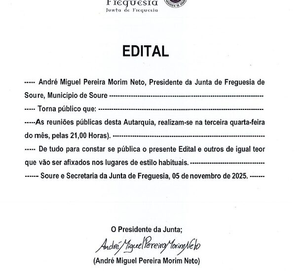 André Miguel Pereira Morim Neto, Presidente da Junta de Freguesia de Soure, Município de Soure, torna público que: As reuniões públicas desta Autarquia realizam-se na terceira quarta-feira do mês, pelas 21,00 Horas. De