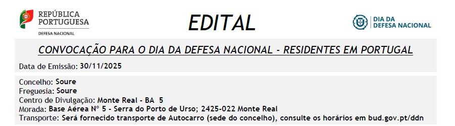 Os cidadãos convocados para o Dia da Defesa Nacional (DDN) devem consultar atentamente o edital anexo, que também pode ser consultado na Junta de Freguesia de Soure ou em bud.gov.pt/ddn, onde consta a